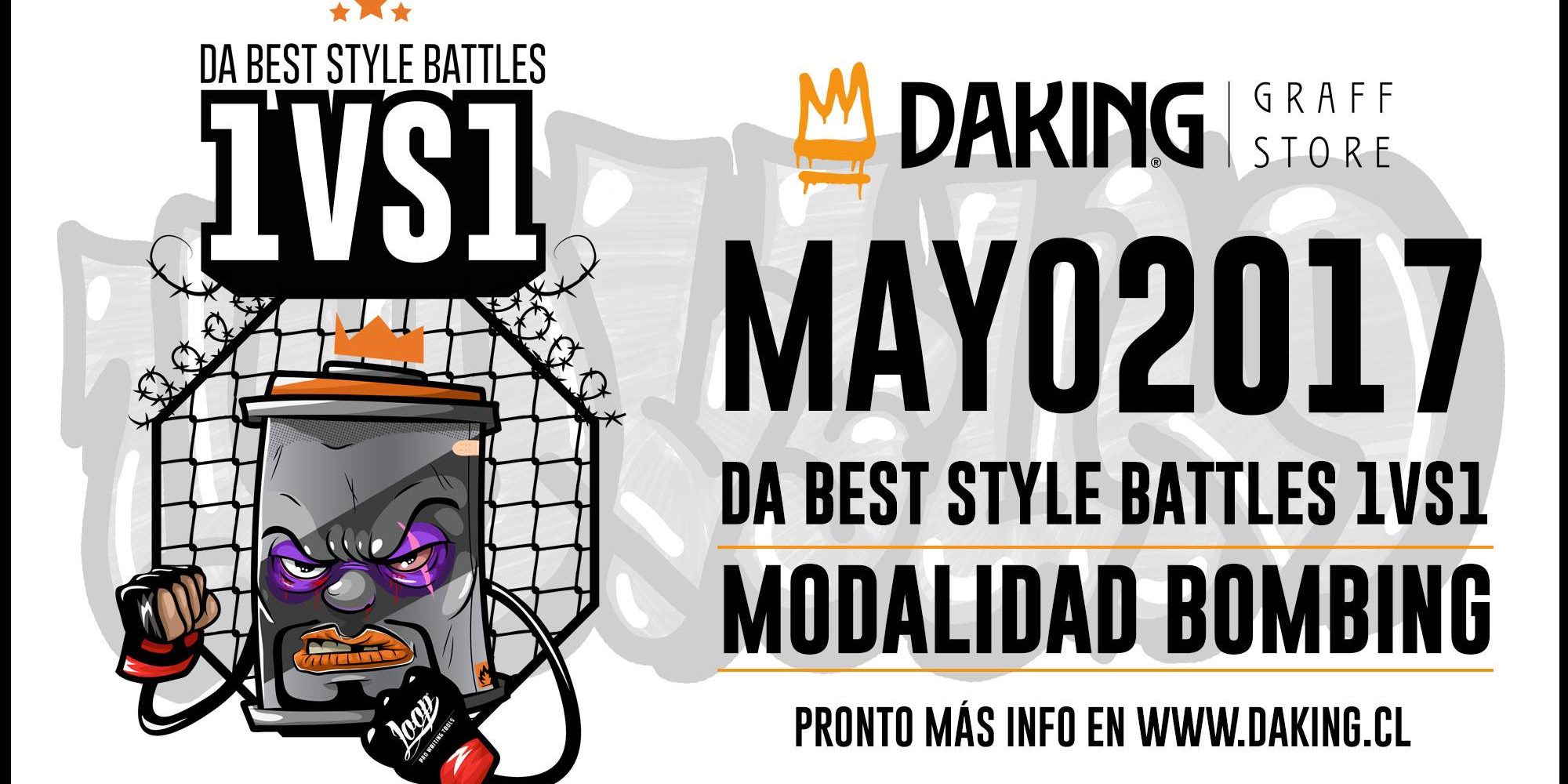 LOS CONCURSANTES SE ELIGIRAN PREVIO FILTRO. EL FILTRO SE REALIZARA ENTRE LOS DIAS 01 DE ABRIL Y 10 DE ABRIL, DEBIENDO ENVIAR 2 FOTOS DE SUS TRABAJOS (DE PREFERENCIA BOMBING) AL MAIL CONTACTO@DAKING.CL CON EL ASUNTO “1VS1”. EL FILTRO SE HARA MEDIANTE UN STAFF DE JURADOS INTERNOS DE DAKING. UNA VEZ SELECCIONADOS DEBERAN CONFIRMAR SU PARTICIPACION MEDIANTE LA INSCRIPCION QUE TENDRA UN VALOR DE $6.000 POR PERSONA (INCLUYE LOS AEROSOLES, CAPS, POLERAS, COMIDA Y BEBESTIBLE EL DIA DEL EVENTO). DE NO ACREDITAR SU PARTICIPACION HASTA EL DIA 20 DE ABRIL SE DARA PASO A OTRO CONCURSANTE.
