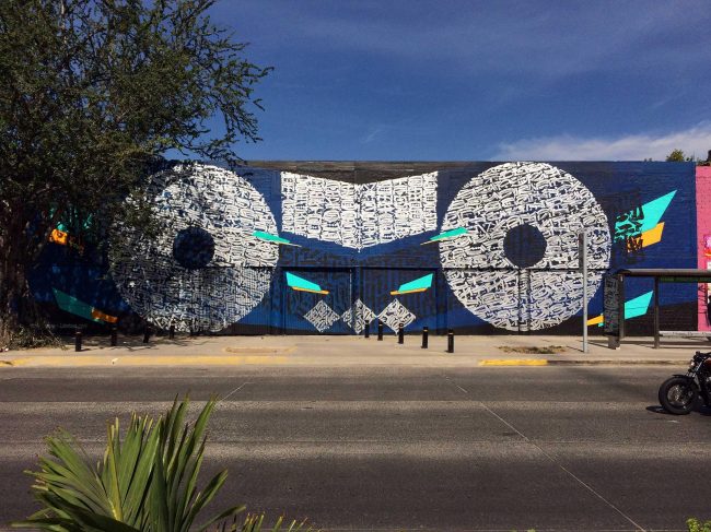 Esta pieza es un homenaje a la sabiduría milenaria, a la cosmogonía indígena y al pensamiento antiguo y hace referencia directa al Dios de la lluvia prehispánico Tlaloc, representado por esos dos grandes círculos realizados a base de caligrafía y los elementos geométricos que los acompañan. Para Said Dokins existe una relación simbólica muy fuerte…