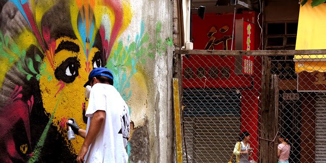 El artista callejero colombiano, es un trotamundo, mas de alguna vez a pintado retratos convinados con abstracciones de energias y patrones. Checkea las fotos!